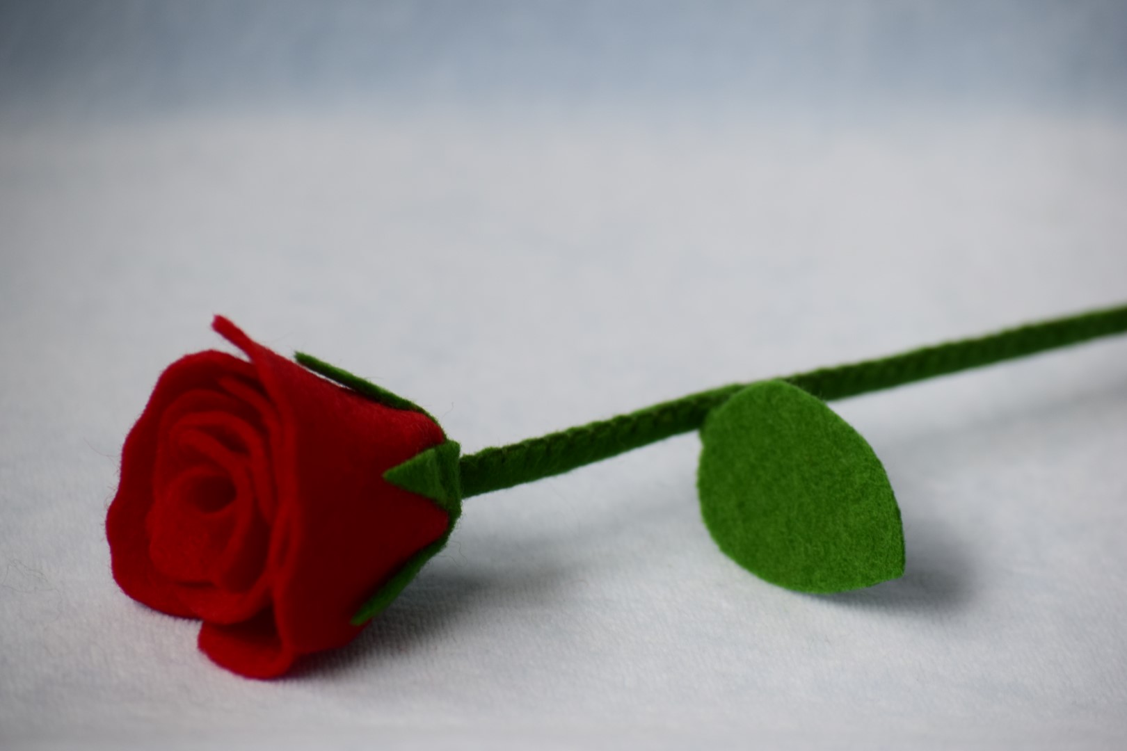 Van vilt maken we een roos, het symbool voor de liefde. De roos is ongeveer 30 cm. lang en staat prachtig in een vaasje.