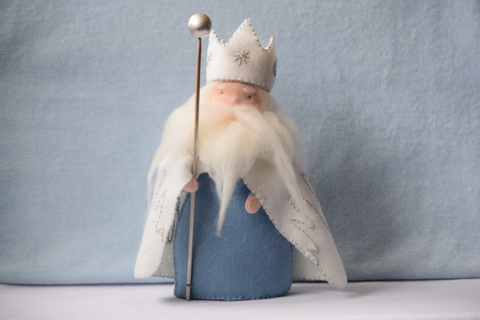 Koning Winter is gemaakt van wolvilt en is ongeveer 20 cm. hoog. Zijn lijf is blauw van kleur. Op de korte witte mantel zijn ijspegels geborduurd met zilverkleurig draad. Ook de kroon is wit en heeft een zilverkleurige afwerking.
